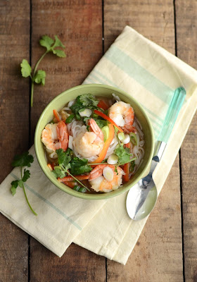 Run the noodles under hot water to prevent sticking and divide among two bowls. Remove the shrimp and set aside. Pour the stock over top and arrange the shrimp on top. Add a bit of fresh cilantro on top to garnish.
